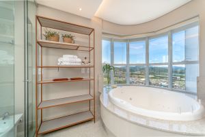 Com 238 m² de área privativa e quatro suítes, um dos grandes atrativos é a vista privilegiada para a orla, onde é possível apreciar o mar e acompanhar a chegada dos cruzeiros, além de atrativos do município como o espetáculo de fogos que marca o Réveillon em Balneário Camboriú.